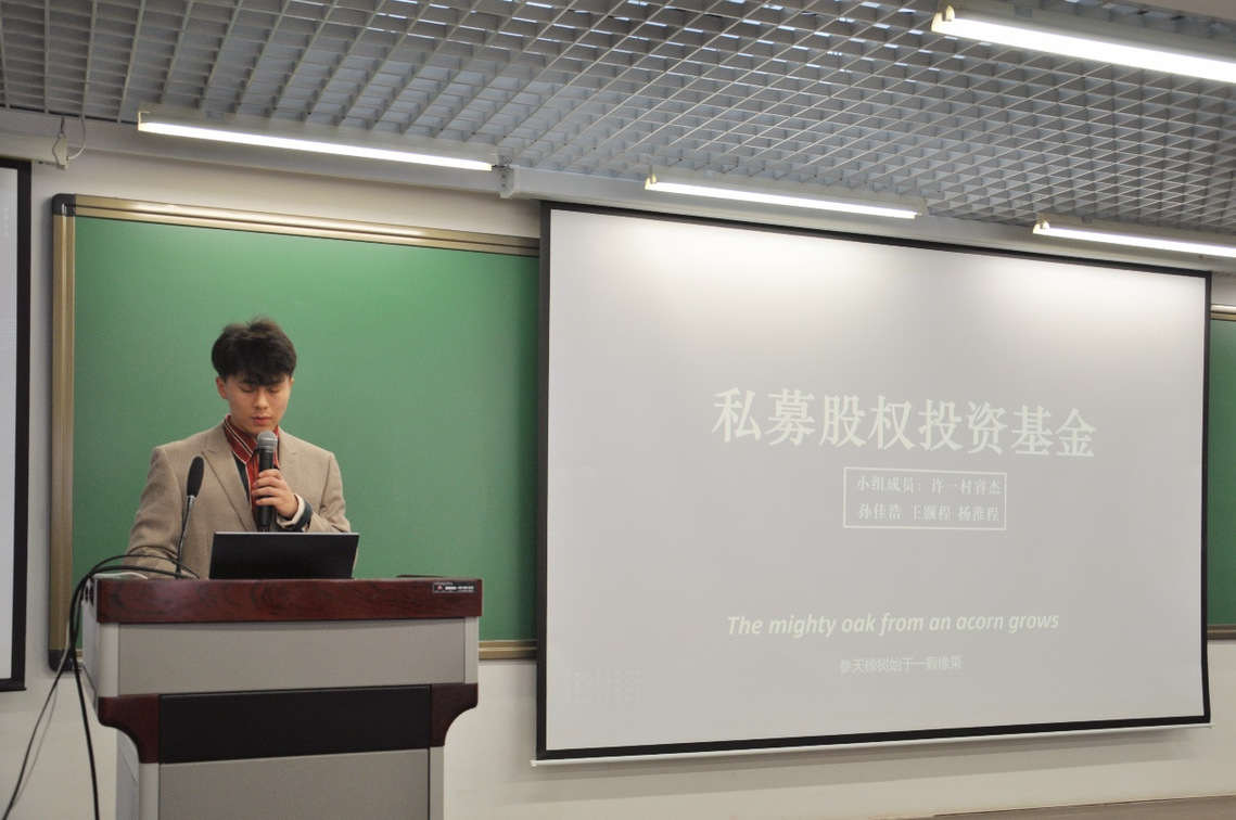 课前,许一村睿杰同学代表所在小组,就私募股权投资基金进行了精彩的展示。他详细分享了私募股权投资的四个主要阶段及其各自的特点,为同学们提前梳理了相关知识框架,也为李皓鹏校友随后的讲解做了充分的先导铺垫。此外,许一村睿杰同学还结合了欧盟碳关税、生物制造与半导体产业格局等近期热点话题,向李皓鹏校友提出了针对性的问题。在课堂上,李皓鹏校友对这些问题进行了逐一解答,深入浅出地为同学们剖析了私募股权投资在当前经济形势下的实际应用与发展动态。