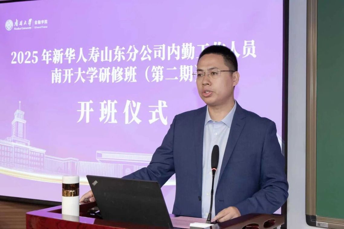 开班仪式上,张尧代表学院对新华人寿山东分公司学员的到来表示热烈欢迎。他提到,金融学科作为南开大学的传统优势学科,拥有深厚的历史底蕴与显著的学科特色,并在发展过程中深度契合时代发展方向。他提到,终身学习是个人与单位的共同追求,时刻站在学科前沿、引领学科发展是大学的使命。培训班的顺利开展,既是新华人寿山东分公司对金融学院的信任,也是对终身学习理念的认可;同时,培训过程也是学校教师向一线从业者学习的宝贵机会。张尧表示,此次研修班是南开大学与新华人寿深化合作的重要举措,学院将依托学科优势,为学员搭建高质量的知识交流平台,助力行业骨干更新专业认知、提升业务能力,共同推动金融保险行业发展。