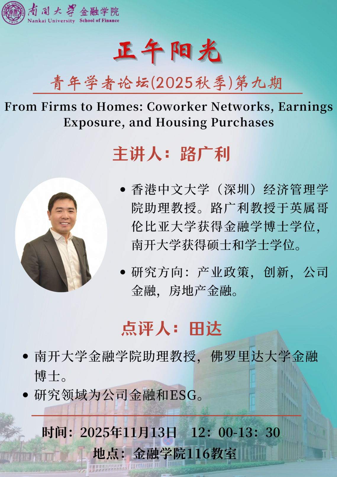 讲座题目:From Firms to Homes: Coworker Networks, Earnings Exposure, and Housing Purchases