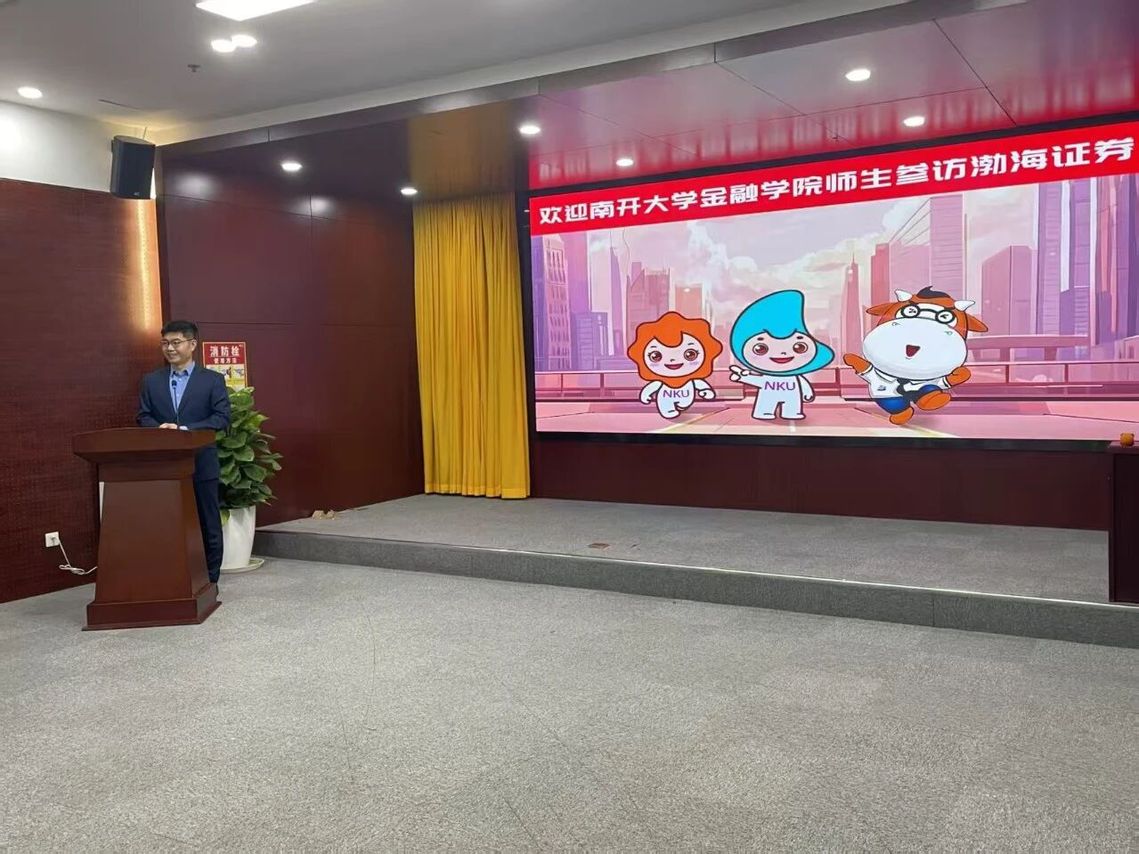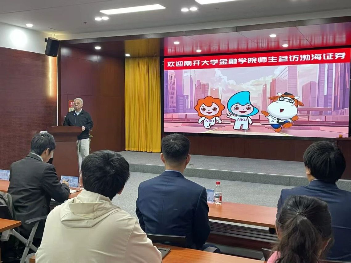活动伊始,刘澜飚教授率先致辞。他深情回顾了南开大学金融学院与渤海证券多年来的深厚合作渊源,从渤海证券创办初期到如今的高质量发展阶段,双方在学术研究、人才培养等多个领域开展了丰富且深入的合作。作为天津本土优秀的市管金融机构,其发展历程是中国证券行业发展的生动缩影。刘澜飚鼓励同学们珍惜此次参观学习机会,主动向渤海证券的行业专家请教,深入体会资本市场对中国经济现代化发展的支撑作用,全面了解证券公司的运营管理模式,将理论知识与实践应用紧密结合。