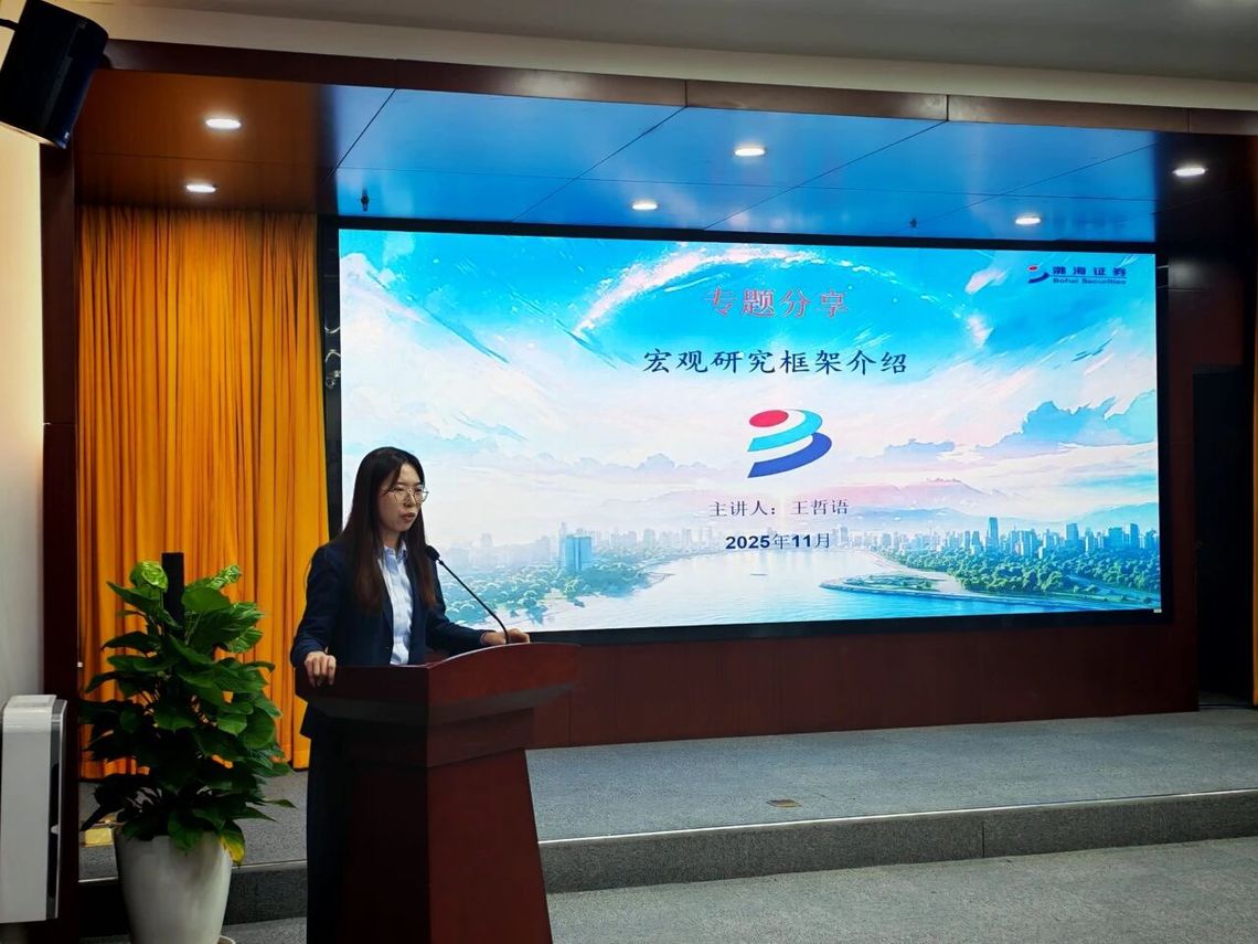随后,渤海证券研究所研究员王哲语以宏观经济研究框架及应用为主题展开分享。作为南开大学经济学院校友,她以亲切的口吻拉近了与同学们的距离,从学术机构、政府部门、金融机构三个视角,辨析了宏观经济研究的差异与联系。她指出,金融机构的宏观研究以市场为导向,核心目标是服务于资产配置,通过对经济增长、通胀水平、政策导向的研判,指导资产投资决策。王哲语结合供需理论、经济周期理论等核心知识,帮助同学们理解宏观经济研究在实际金融工作中的应用逻辑,强调打好宏观经济学基础对未来职业发展的重要性。