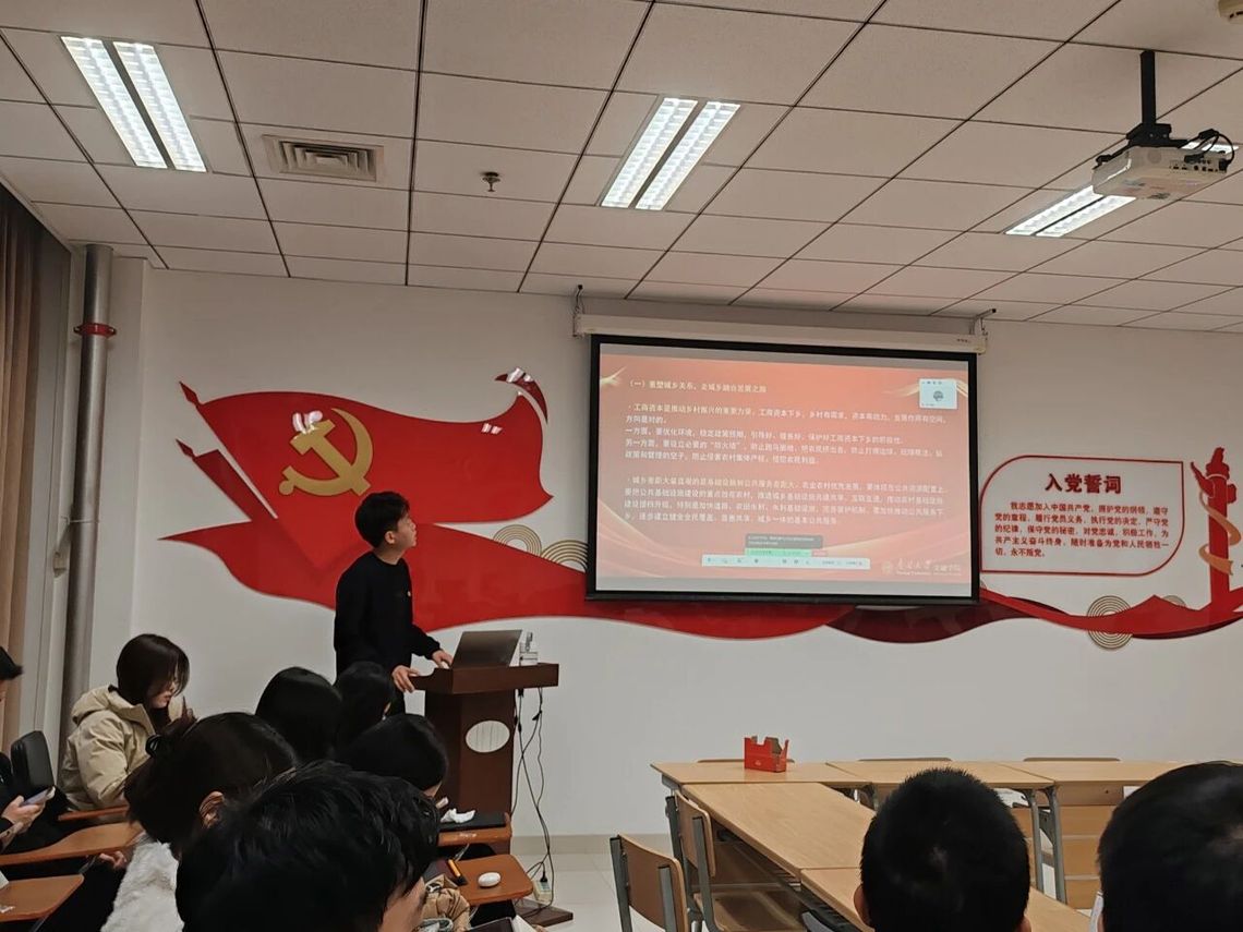 金融专硕第二党支部书记苗松源聚焦“加快农业农村现代化,扎实推进乡村全面振兴”,以《走中国特色社会主义乡村振兴道路》一文为依托,从产业兴旺、生态宜居、乡风文明、治理有效、生活富裕五个维度,解析“三农问题”这一全党工作重中之重的实践路径,强调要提升农业综合生产能力、推进和美乡村建设、强化强农惠农富农政策效能。