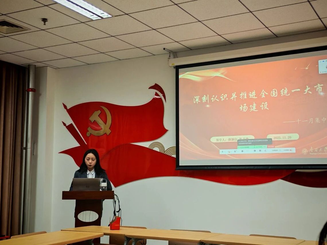 金融专硕第三党支部书记颜颖仪解读全国统一大市场建设,指出这是构建新发展格局、推动高质量发展的基础支撑,需坚持“五统一、一开放”(统一市场基础制度、统一市场基础设施、统一政府行为尺度、统一市场监管执法、统一要素资源市场、持续扩大开放),并结合《建议》中“有效市场和有为政府相结合”的要求,明确“十五五”时期破除市场卡点堵点的主攻方向。