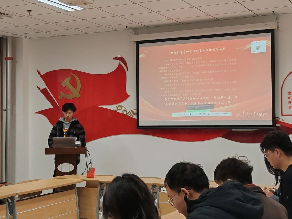 金融专硕第四党支部党支书安建豪围绕“加快构建高水平社会主义市场经济体制”展开论述,强调这是应对国际形势变化、解决国内发展不平衡不充分问题的关键举措。他结合《文选》与《建议》,从激发经营主体活力、完善要素市场化配置、提升宏观经济治理效能三个方面分析实践路径,并针对《建议》中与金融专业密切相关的“积极财政政策”和“建设金融强国”两大板块进行深入浅出的解读。