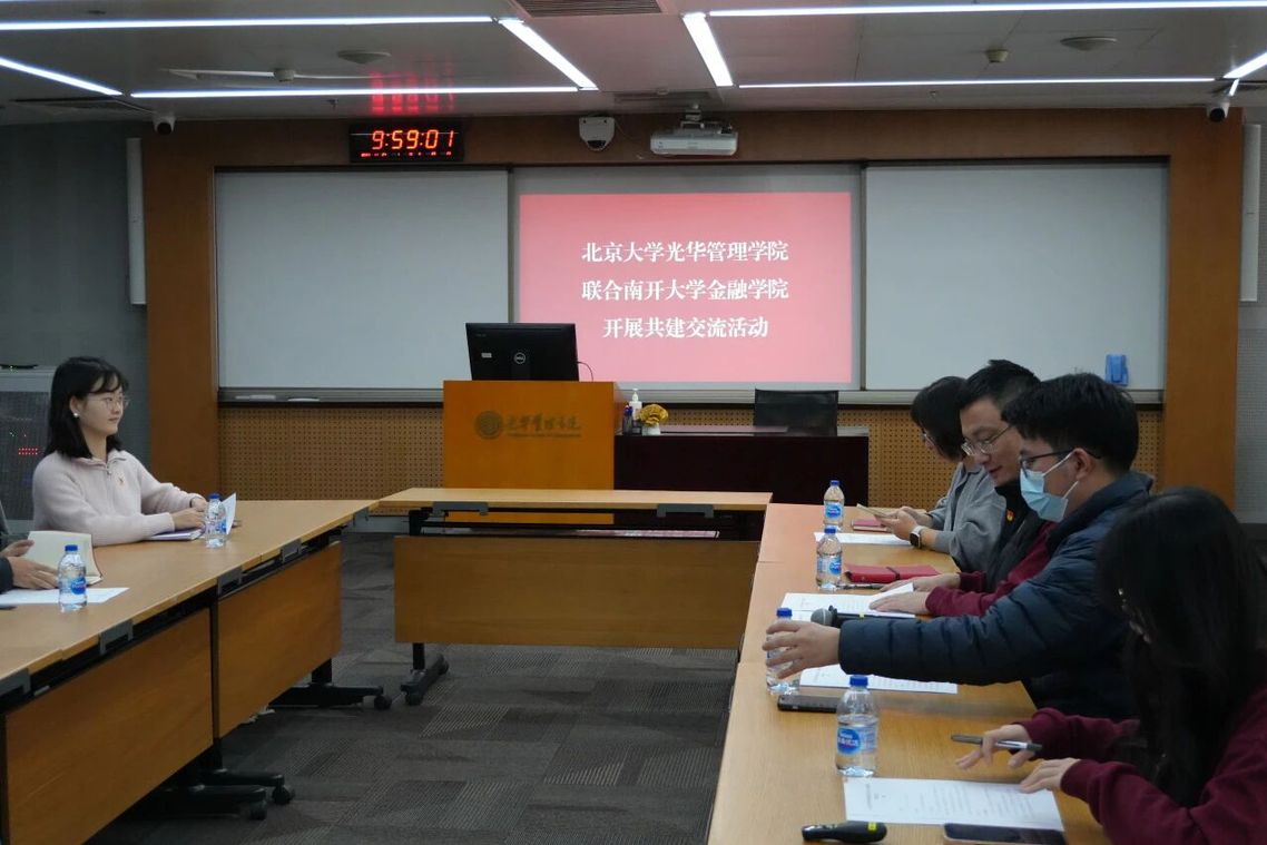 当天上午,南开大学金融学院党委副书记、副院长高珊带队,就业工作专员唐琳、党建工作专员李佳音及本科生党团支部、学生职业发展中心学生代表一行首站抵达北京大学光华管理学院开展共建交流。北京大学团委副书记、光华管理学院党委副书记鞠晓,北京大学团委组织部部长、光华管理学院团委书记王剑,学生办公室副主任王欢,团委常务副书记徐瑗依及本科生党支部代表出席活动。