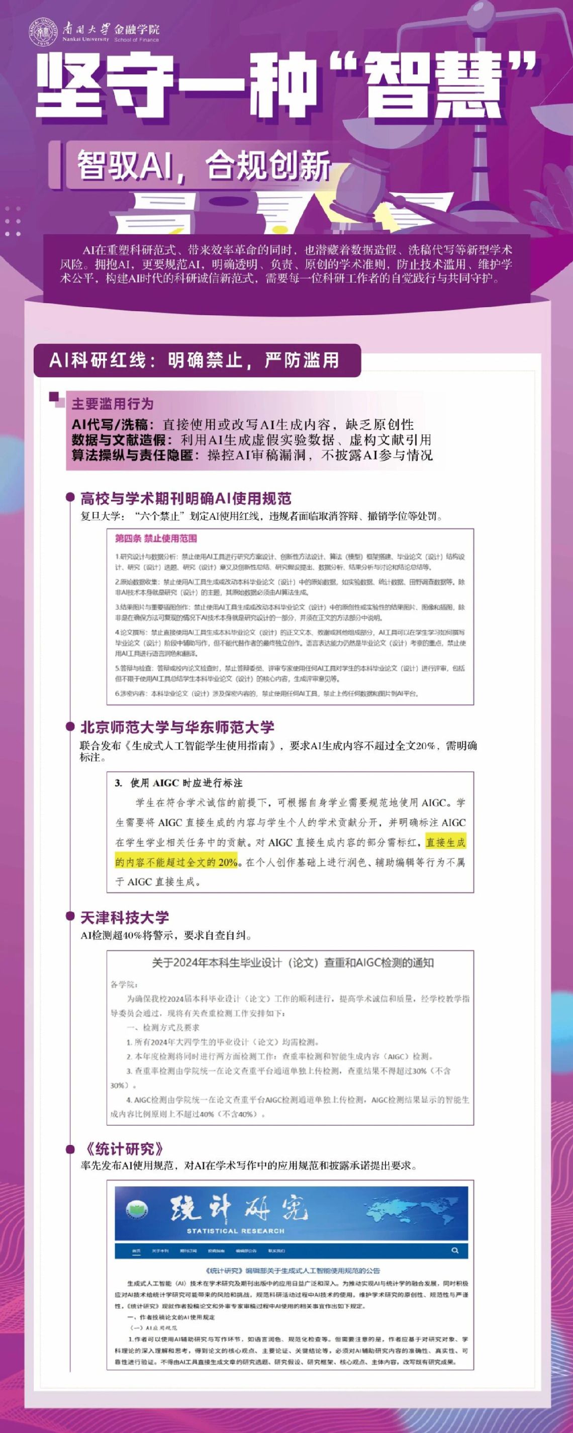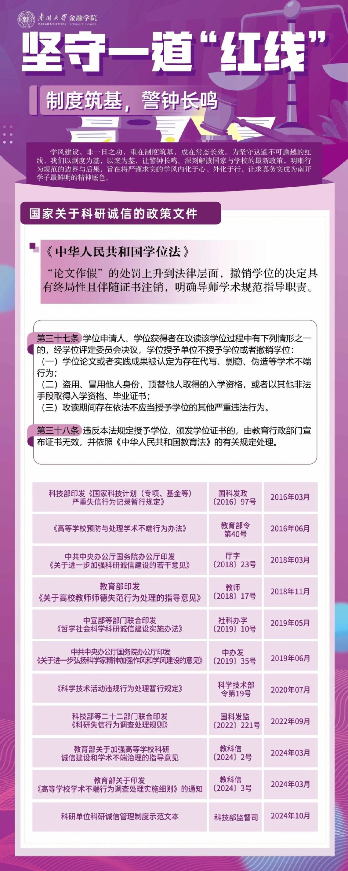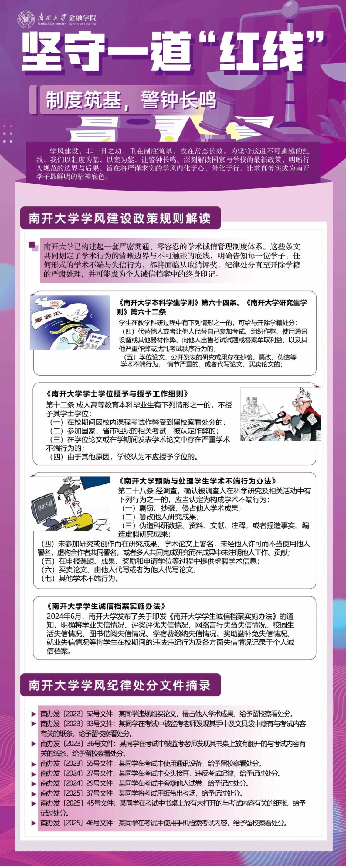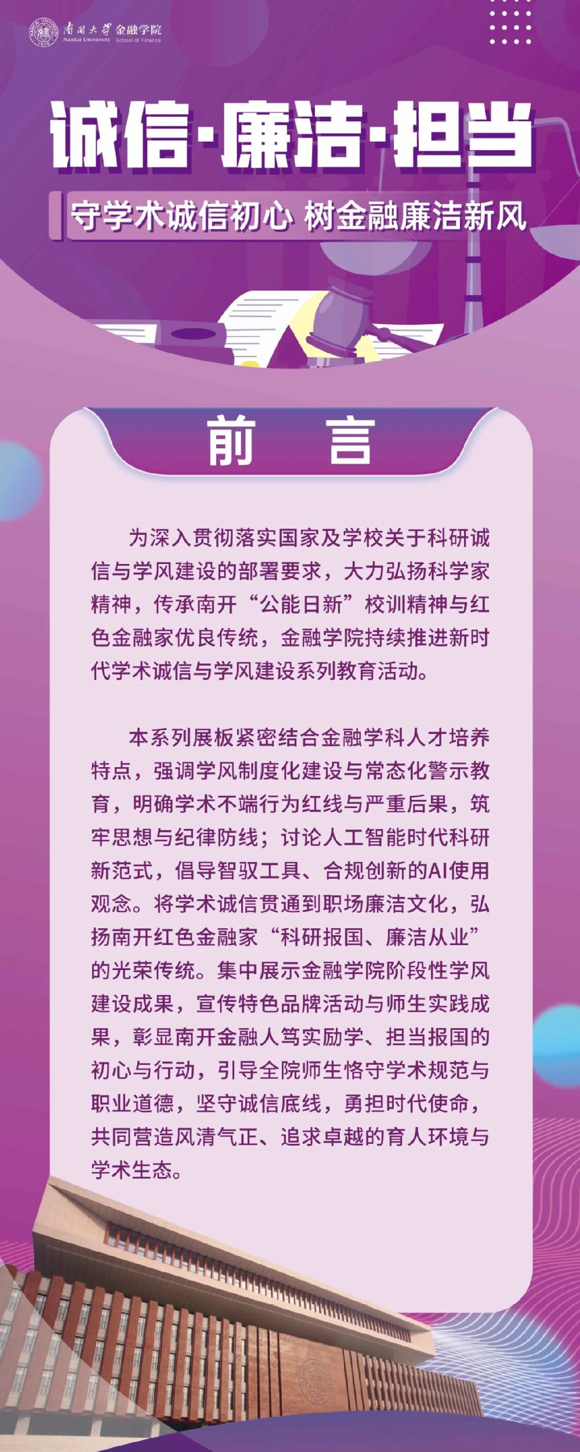 以学风铸魂,以诚信立身。此次展出的学风系列展板,既是学术诚信的警示录,也是金融廉洁的践行指南。诚邀金融金融学院全体师生前往学院一楼大厅参观学习,将诚信廉洁刻入心中,把担当使命落到实处,共同营造风清气正的学术生态,筑牢南开金融学风建设的坚实根基!