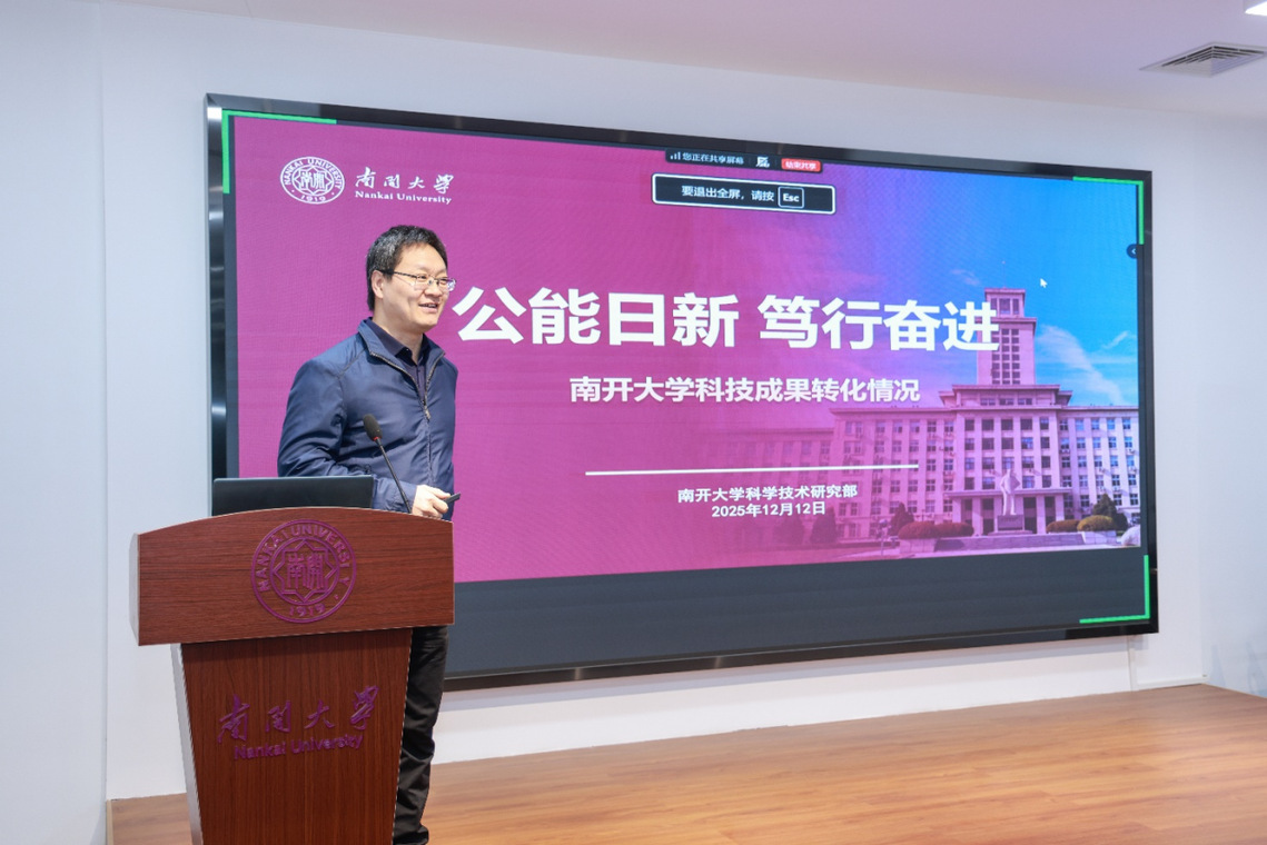 随后,南开大学科学技术研究部常务副部长金柏江详细介绍了学校技术转移与成果转化工作的进展与成效。金柏江表示,南开大学在技术转移和成果转化方面取得了显著进展,通过优化机制、深化校地合作以及培育高价值项目,有效推动了科研成果从实验室走向市场应用。他还重点介绍了南开大学在专利管理办法、预审完善和专利导航等多项创新举措,以及提升科研成果的保护质量与应用效率的体系化保障措施,更好地服务国家战略与产业发展需求。
