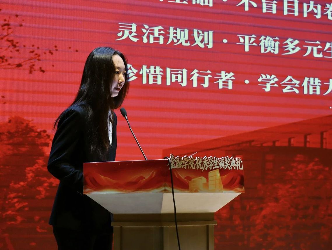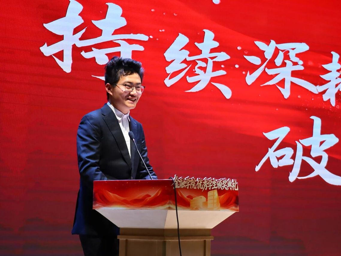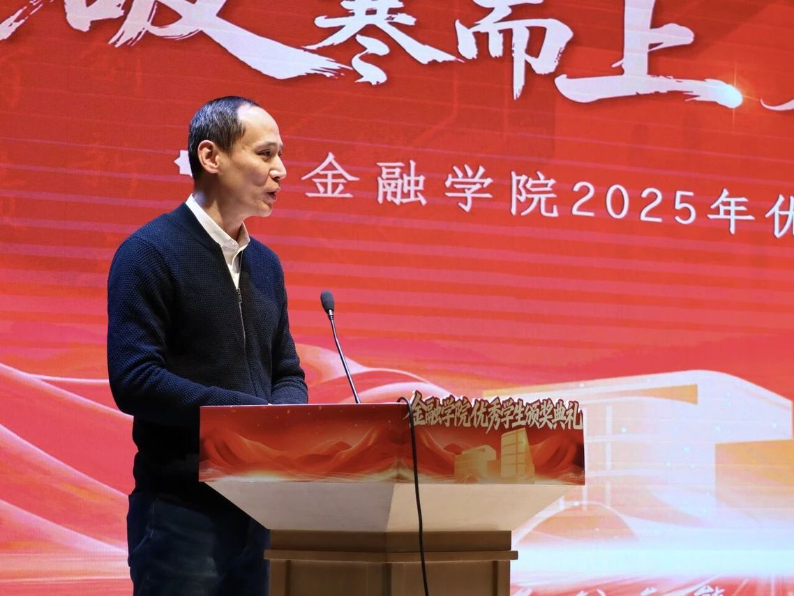 金融学院党委书记张尧发表讲话。他表达了对同学们的祝贺与期待,并从三个方面寄语青年学子。第一,希望同学们珍惜宝贵的青春年华,主动探索、尽早确立属于自己的人生追求,这比成绩与奖项更为根本。第二,要建立勇敢面对挑战的信心,无论是学业还是未来职场,压力与竞争始终存在,只有以“我能”的信念主动迎战,才能获得持续前进的动力。第三,要拥有平和的竞争心态,做到理性看待竞争、勇敢参与竞争,更要智慧地驾驭竞争,做到“躬身入局”而又保有“上帝视角”,不成为输赢的奴隶。他强调,人生的意义在于经历、体验与贡献,真正的成功是成长,期望同学们在取得成绩的基础上,培养健全人格与成熟心智,走好未来长远的人生道路。