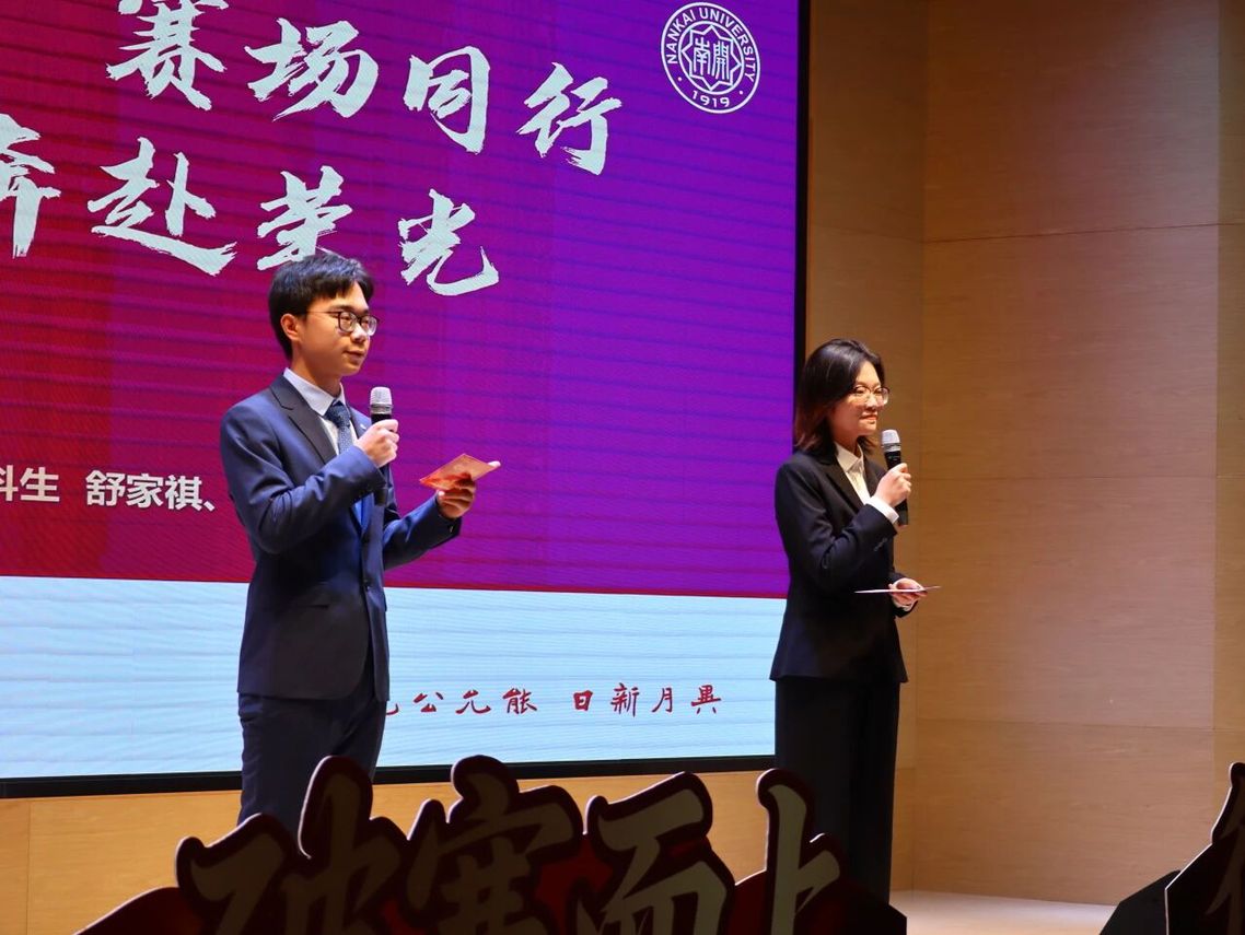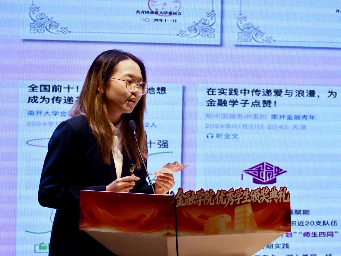 中国未来金融分析师大赛全国铜奖获得者姜凯航、全国英语演讲大赛一等奖获得者王元珩、挑战杯全国三等奖获得者张小雅,全国“三下乡”社会实践优秀团队负责人梁磊、南开大学社会实践十佳个人王宇杰,”五月的鲜花”合唱比赛代表舒家祺、金融学院运动队领队何仲昆,天津市优秀学生干部、周恩来奖学金初评前十名许嘉琪,2025届校友卢芳雨,2024届校友邹寒露在现场结合自身经历,从不同维度展现了南开金融人“公能兼备、勇担使命”的精神风貌。