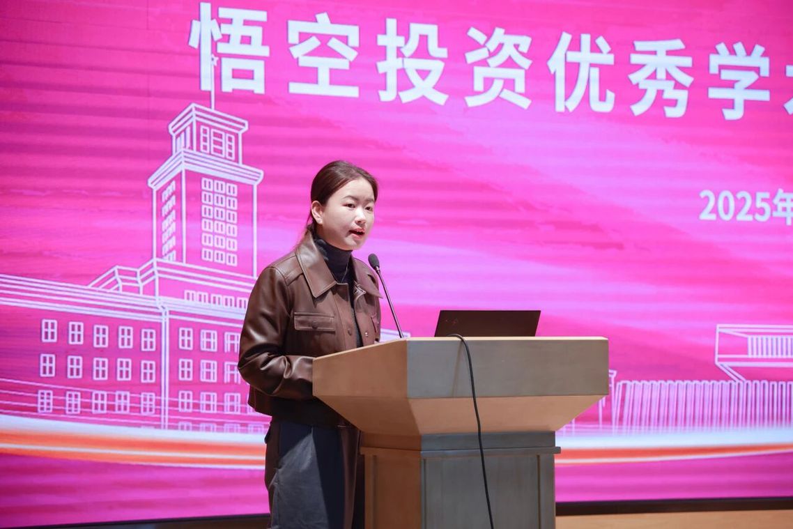 荣获“悟空投资优秀论文奖”特等奖的杜霞老师作为获奖教师代表发言。她表达了对鲍际刚校友慷慨资助的感谢,感受到校友对母校的深情厚谊。同时,她也感谢学校与学院打造的优质科研平台,表达了继续坚守育人初心,探索更高效、更高水平教学科研的决心。
