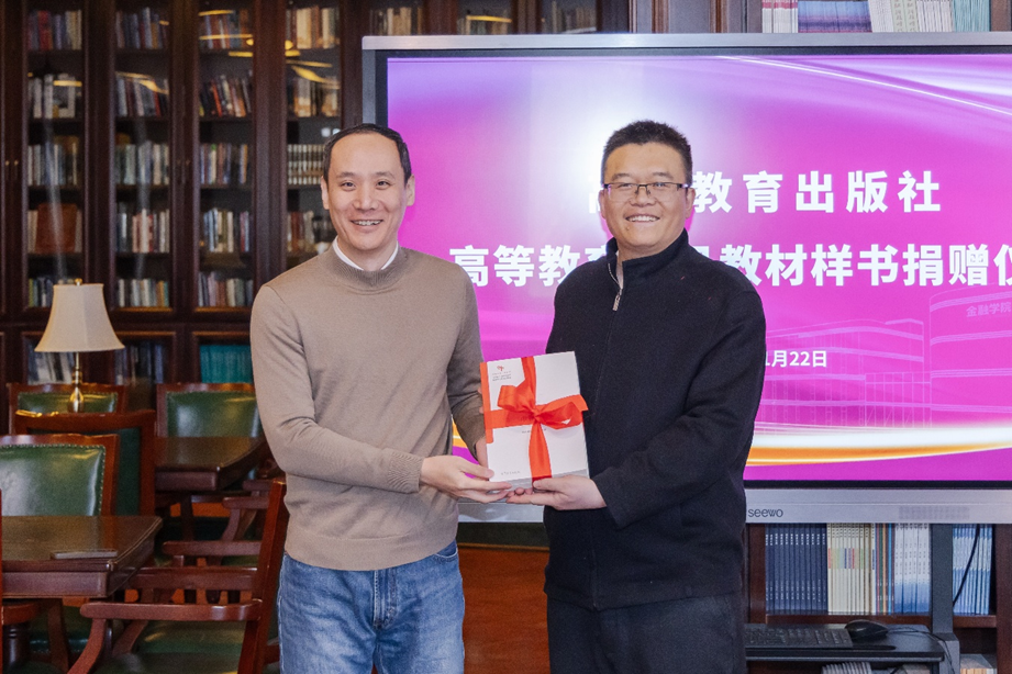 于明主任代表高等教育出版社向金融学院捐赠了一批精品教材样书。金融学院党委书记张尧代表学院接收赠书,并向高等教育出版社颁发了捐赠证书及纪念牌,以感谢其慷慨支持与深厚情谊。