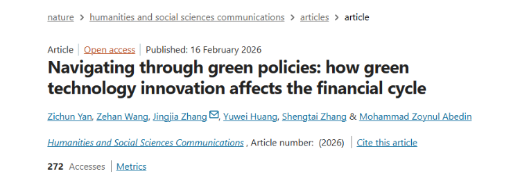 近日,由南开大学金融学院博士生王则翰(共同一作)、APEC研究中心副研究员张靖佳(通讯作者)与北京邮电大学经济管理学院教授严子淳(我校2015届博士毕业生)等学者合作撰写的论文“Navigating through green policies: how green technology innovation affects the financial cycle”在国际顶级学术期刊Humanities & Social Sciences Communications在线发表。该期刊为Nature旗下唯一面向人文社会科学领域的子刊,在JCR社会科学分区为Q1,中科院人文科学一区。根据Web of Science期刊引用指数,该期刊在人文学科-多学科领域的409种期刊中排名第3,在社会科学跨学科领域的265种期刊中排名第1。