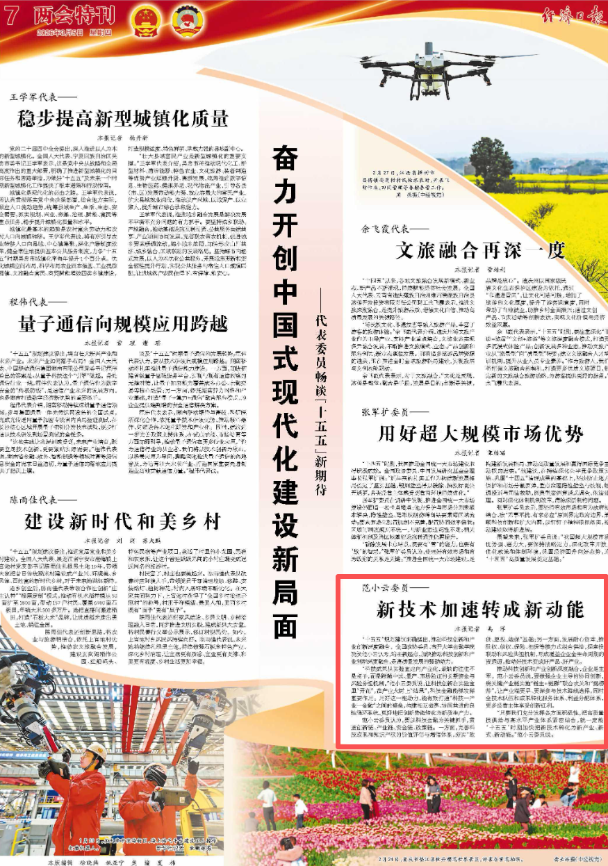 “只要我们充分发挥各方面积极性,把高质量科技供给与高水平产业体系紧密结合,就一定能在‘十五五’时期加快把新技术转化为新产业、新模式、新动能。”范小云委员说。