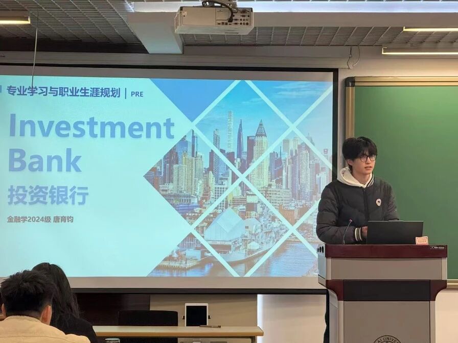 课程开始前,2024级本科生唐育钧进行课堂展示。他以影视选段引入,回顾了对投行工作的朴素理解,结合时事热点为同学们建立起了行业的总体印象。他还针对人工智能对行业的冲击等新变化提出思考问题,启发同学们对课程的深入讨论。