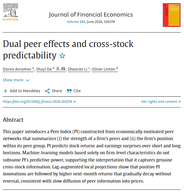 研究提出了一种基于经济关联的“同行指数”(Peer Index),通过构建同行网络系统性地捕捉两类同行效应——同行群体整体强度与企业在群体中的相对位置。实证分析表明,该指数能够有效预测股票在短期和长期内的收益率以及盈余公告超预期程度,且其预测能力无法被基于个股特征的机器学习模型所涵盖。进一步通过滞后增强型局部投影方法发现,当同行指数出现正向冲击时,下月收益率随之攀升,后续效应缓慢衰减但并未出现反转,这一动态过程与市场信息缓慢扩散的理论预期一致。在控制主流因子模型、投资者情绪与关注度指标后,该指数的预测能力依然稳健。研究还在供应链客户-供应商关系与分析师共同覆盖两类非对称网络中发现,同行预测能力部分来源于因子中性的方向性信息传递。整体而言,该研究通过赋予同行信息以清晰的经济结构,揭示了跨股票可预测性中因市场对网络信息反应不足而产生的系统性定价偏差。