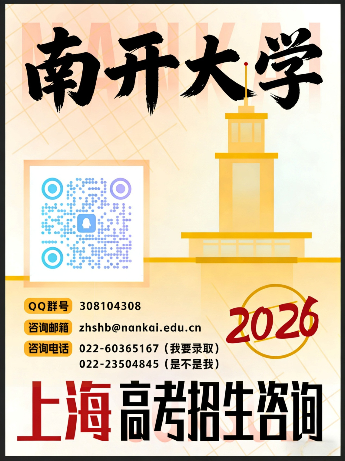 百年南开,薪火相传;允公允能,日新月异。作为国家 “双一流” 建设高校,南开大学始终坚守立德树人初心,深耕拔尖创新人才培养,为学子搭建一流成长平台。2025年,南开大学在沪招生政策诚意十足:考生提档且体检合格后,保证组内第一志愿专业录取(02组中“理科实验班(卓越拔尖计划伯苓班)”不参与上述政策),大类分流时也100%满足类内专业选择意愿,最大程度守护考生专业报考意愿。而针对2026年上海考生,南开大学将延续以生为本的招生理念,更多专属在沪招生政策、招生计划安排即将陆续公布,值得广大考生与家长满怀期待!