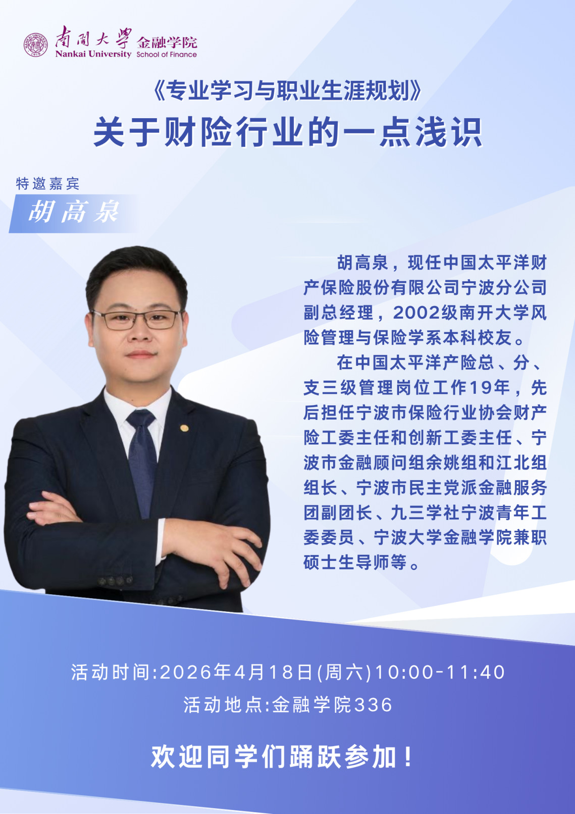 4月18日,本学期课程第五讲将在金融学院336报告厅开讲。