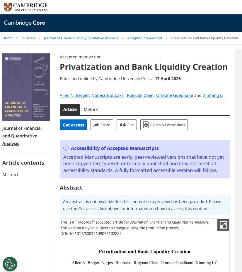 近日,南开大学金融学院长任教授、国家创新与金融研究院跨境金融研究中心主任李欣明在金融学国际四大顶刊Journal of Financial and Quantitative Analysis发表论文《Privatization and Bank Liquidity Creation》。彰显我院青年学者的科研实力与学术影响力。